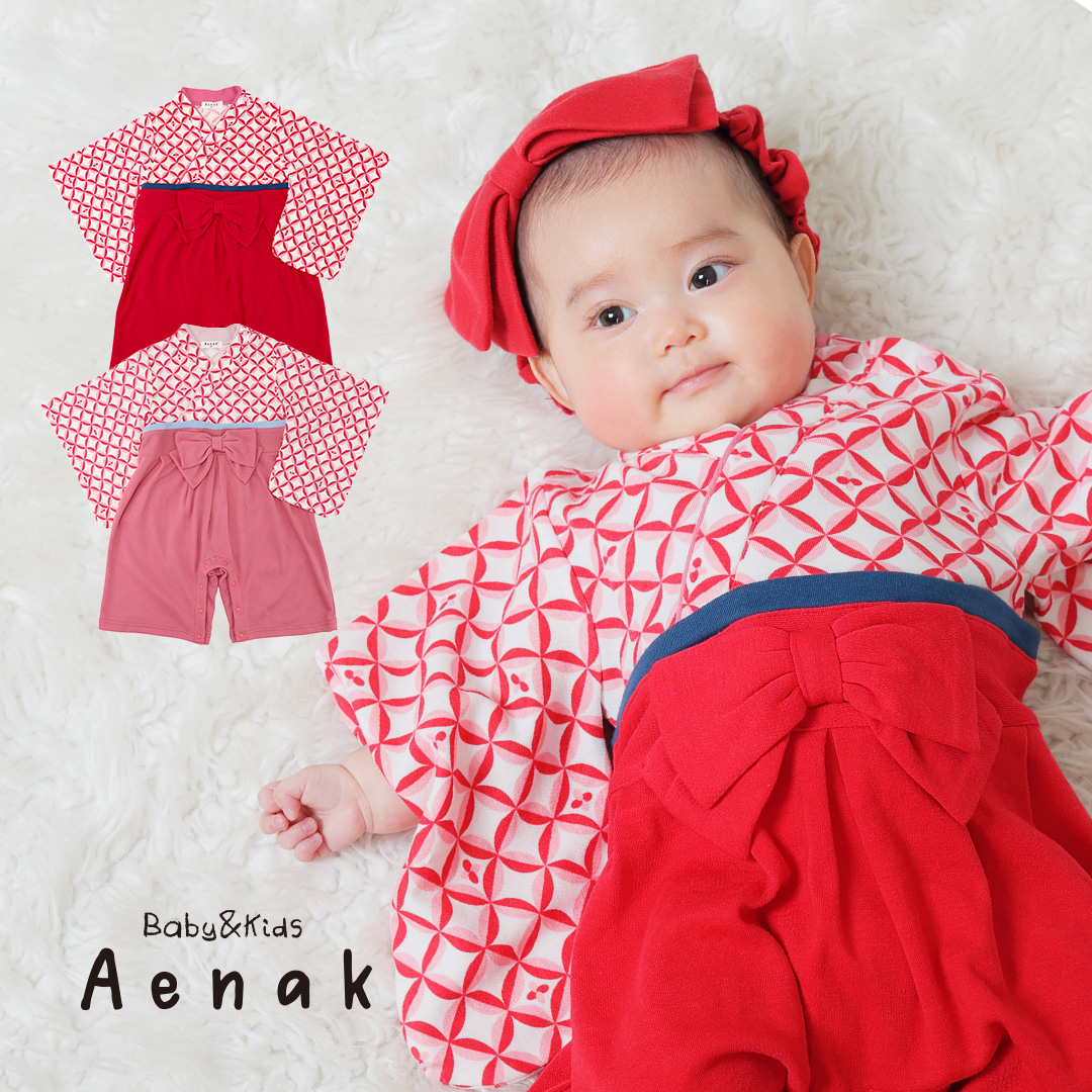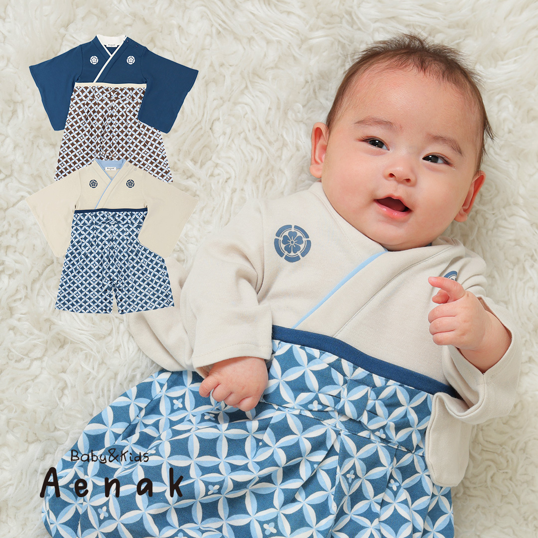 お祝いシーンにぴったりの縁起柄の七宝柄デザインの袴ロンパースが新しく登場しました。 七宝柄(しっぽうがら)は、円が連なり重なり合うことで「円満」「ご縁」「調和」を表す伝統文様です。 人と人とのつながりや永遠の幸せを意味する、縁起の良い柄として知られています。 上品で華やかな印象を添え、晴れの日の装いをより特別に演出します。 男女で同じ柄なので、お揃いで着たりしても可愛いですよ。